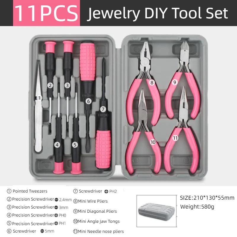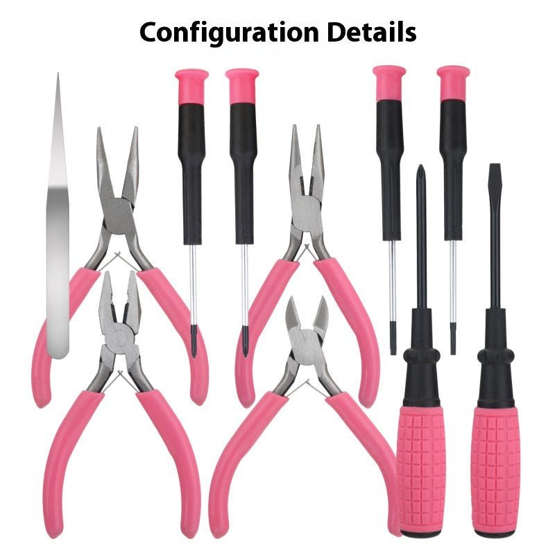 Enhance your DIY projects with this comprehensive set of 11 pink women's compact crafts and home DIY repair hand tools. This kit includes a variety of pliers, cutters, and precision screwdrivers, making it perfect for a wide range of tasks.